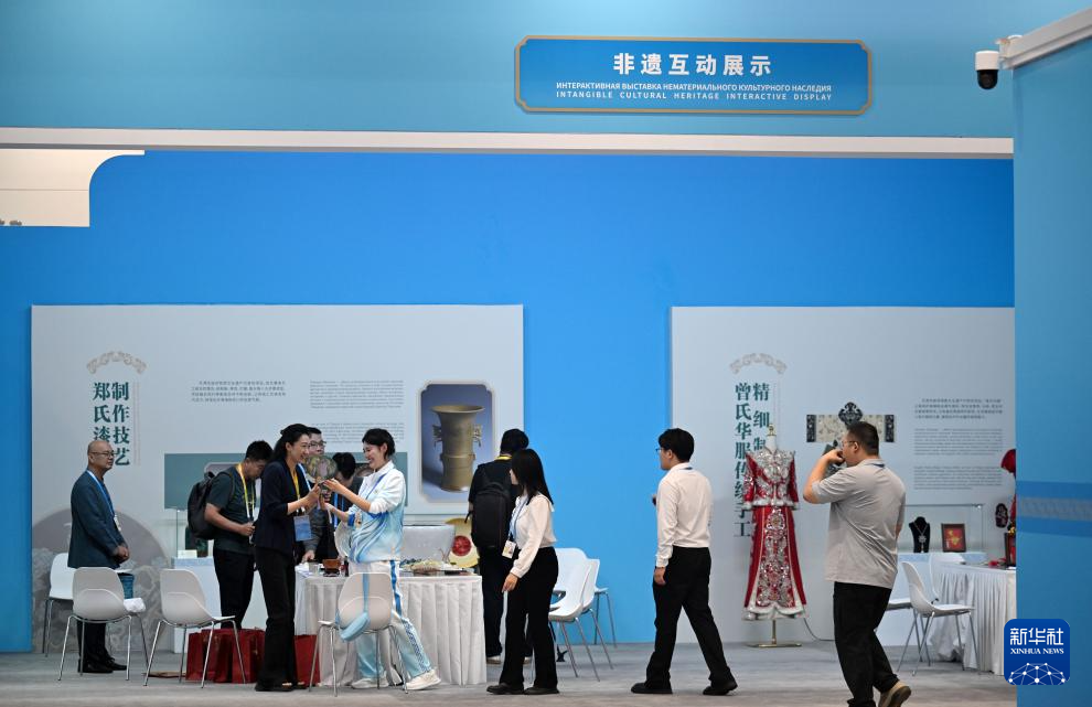8月28日,媒体记者在新闻中心非遗互动展示区了解非遗技艺。