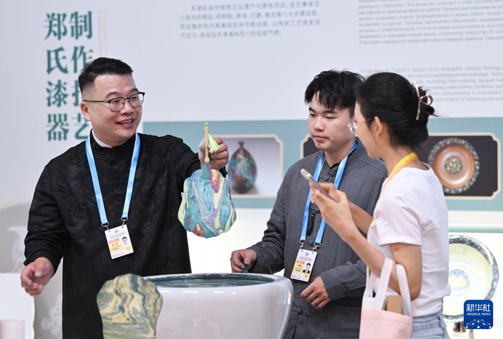 8月28日,新闻中心非遗互动展示区的工作人员(左一)向参观者演示漂流漆技法。