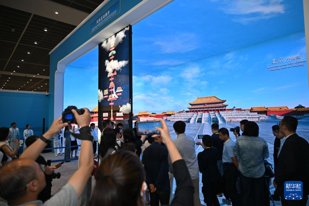 8月28日,媒体记者在新闻中心科技互动展示区参观。