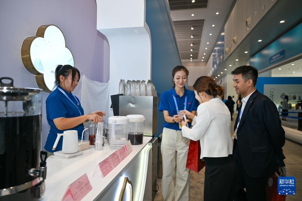8月28日,工作人员在新闻中心内为人们提供饮品。